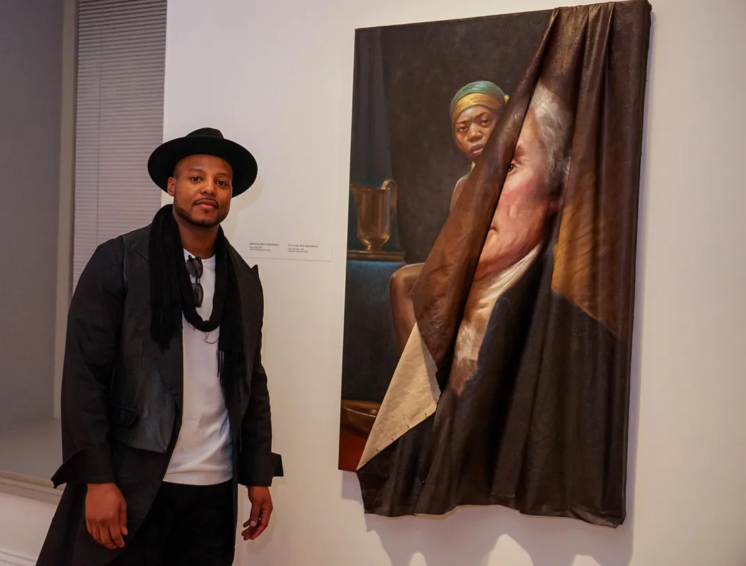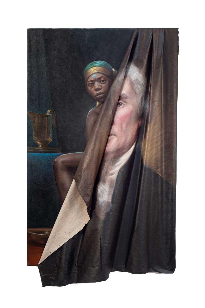 Behind The Myth of Benevolence depicts the image of Sally Hemings, an enslaved woman, covered by a falling portrait of founding father, Thomas Jefferson who owned and impregnated her. Hemings sits naked in a dark room while, from what the viewer can see of Jefferson's portrait, Jefferson sits in a well lit room. Many of Jefferson’s features are distorted by the wrinkles of the falling canvas, what remains clearly visible of Jefferson’s facial features is a piercing blue eye which stares down the audience with an authoritative watch. The fact that the image of Jefferson takes up so much space is in contrast to the woman who sits behind him, peeking over the rumpled cloth that blocks much of her body. We are able to make out her facial features clearly and, in opposition to Jefferson’s tense glare, her eyes look much more saddened.