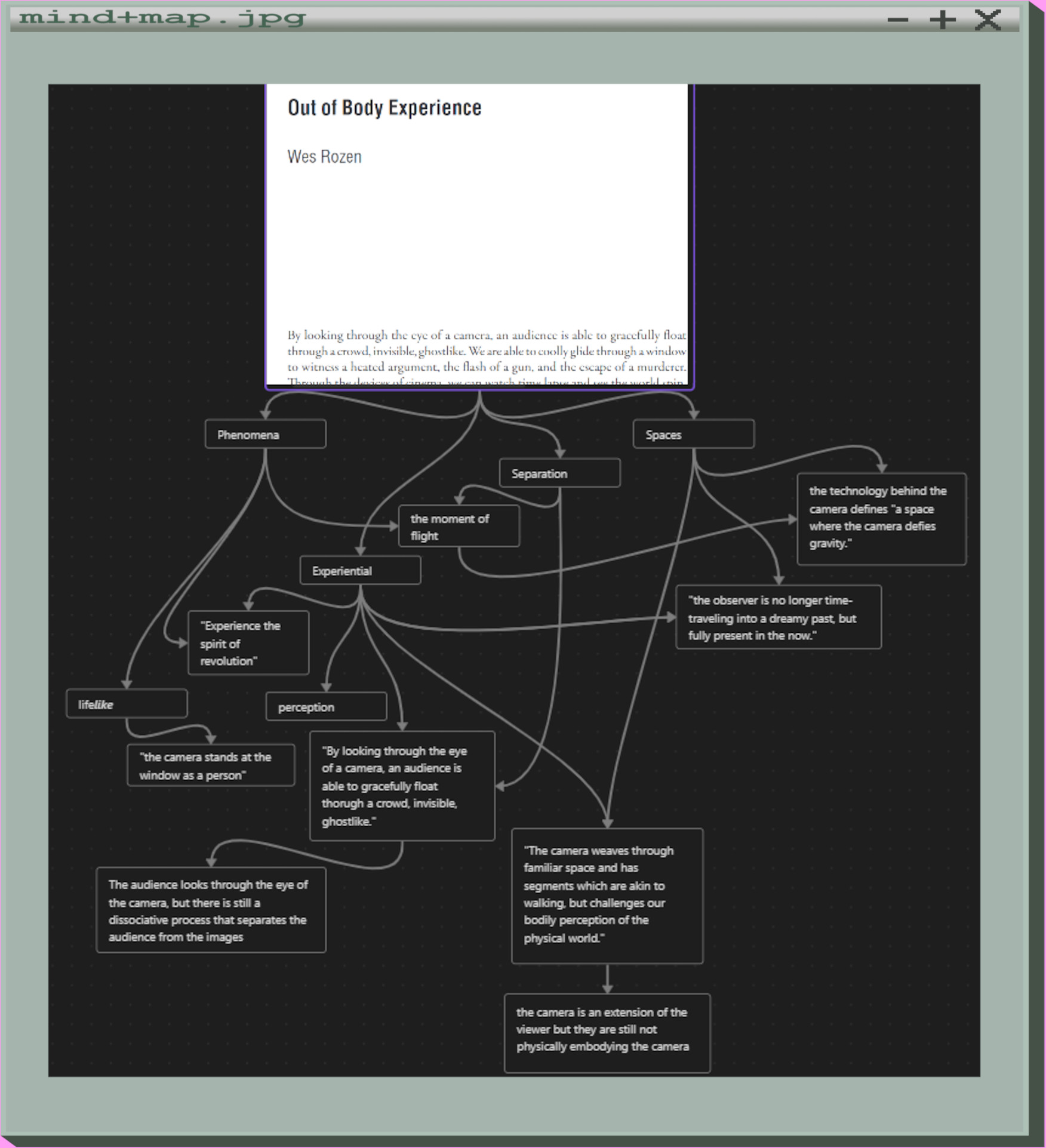 When I begin taking notes, I start by first writing down all the words that jump out to me in the tet or that I associate it with. I like to take notes by making a mind map where certain thoughts are attached to other thoughts, connected by ideas, phrases, or just what makes the most sense to me. THis free-assoicative method of note-taking allows me to remember what stuck out to me immediately and piece together what I remember from the text. The piece I'm annotating is "Out of Body Experience" by Wes Rozen.