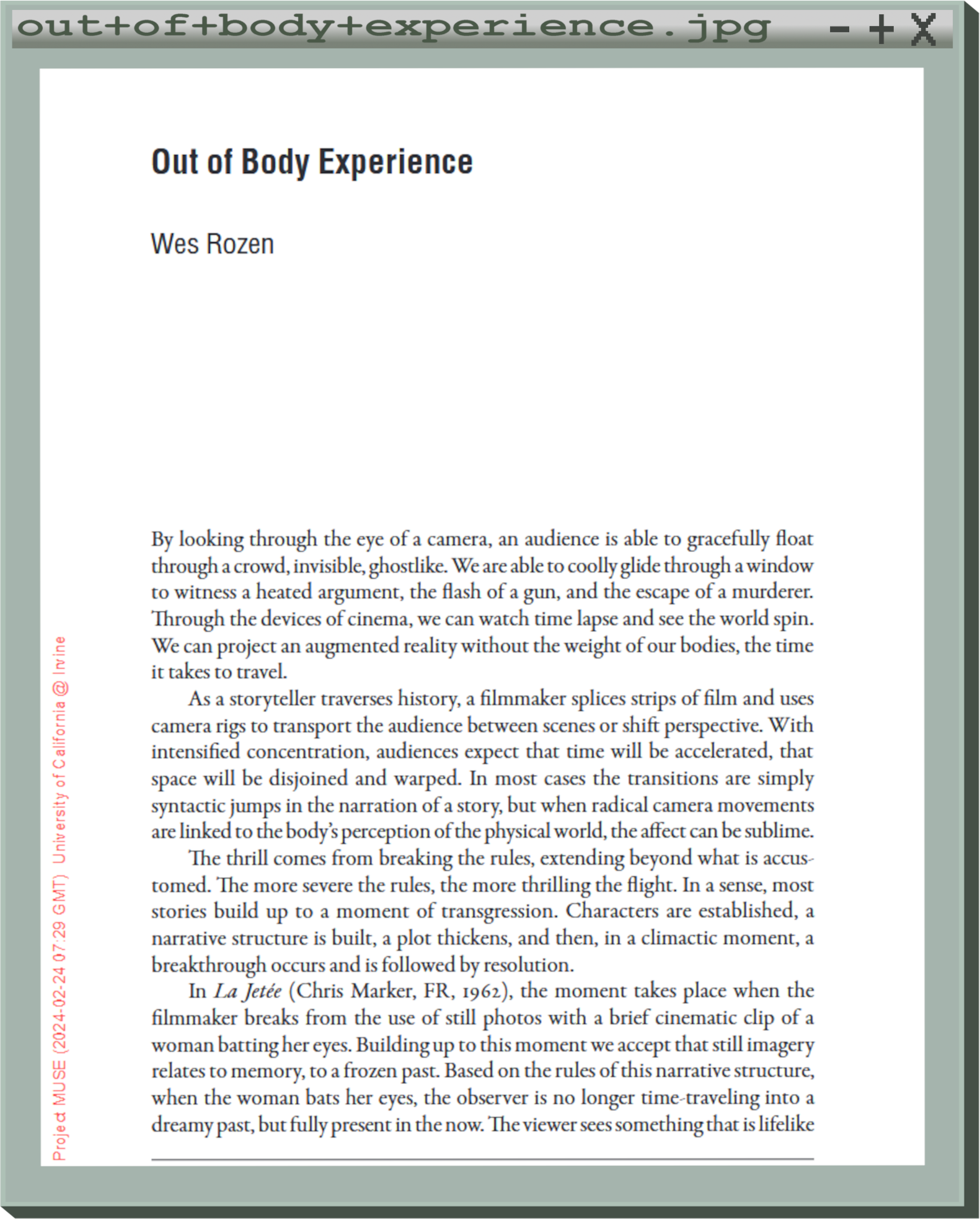 Rozen, Wes. "Out of Body Experience." Framework: The Journal of Cinema and Media, vol. 54 no. 1, 2013, p. 102-104. Project MUSE, https://doi.org/10.1353/frm.2013.0003.